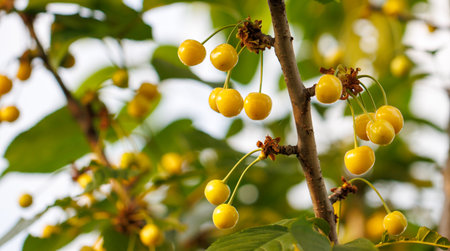 Yellow cherry berries ripen on a tree in the garden