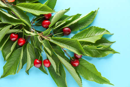 Cherry pattern. Flat lay of cherries and leaves on a blue background.Top view
