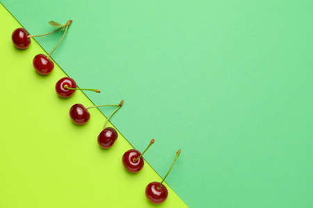 Composition of cherry berries on multicolored backgrounds top view. Creative layout greeting card. Summer design of proper nutrition. Large red ripe berries lie in a circle. Seasonal vitamins.