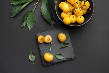 Bowl with tasty sweet cherries on dark background
