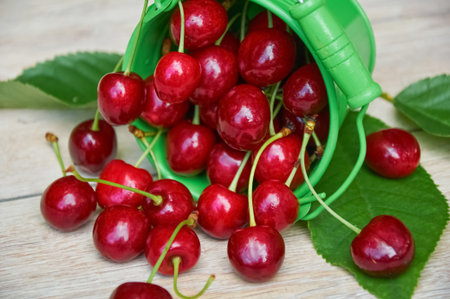 Green bucket tipped over with ripe red cherries spilling onto a wooden surface with green leaves