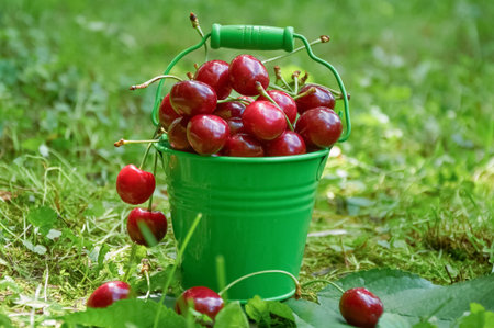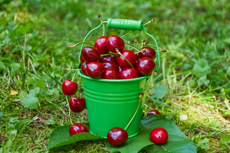 Green bucket filled with ripe red cherries placed on grass with scattered fruit and stems in a garden