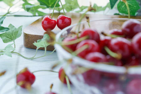 Pile of cherries on white wooden table. Soft focus