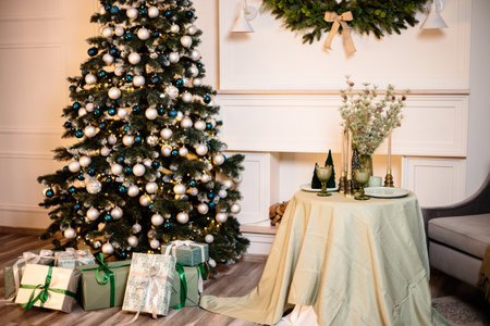 Elegant Christmas tree decorations with ornaments and gifts.