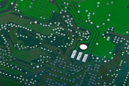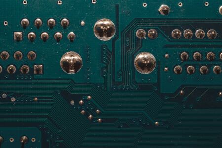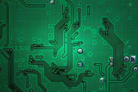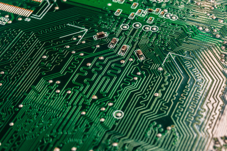 Green circuit board background of computer motherboard macro shot