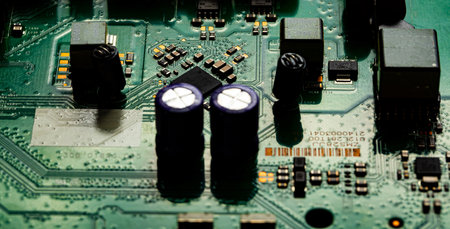 Macro shot of Circuit board with resistors microchips and electronic components. Computer hardware technology. Integrated communication processor. Information engineering. Semiconductor. PCB. Closeup