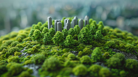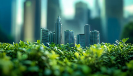 Miniature cityscape featuring skyscrapers and greenery, symbolizing urban sustainability and nature