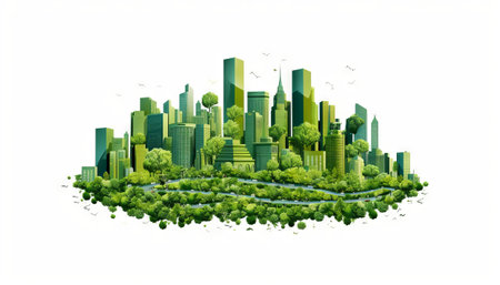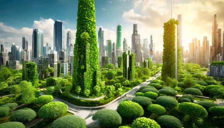 A vibrant cityscape merges with lush greenery, showcasing a harmonious blend of modern architecture and natural beauty, perfect for environmental themes.