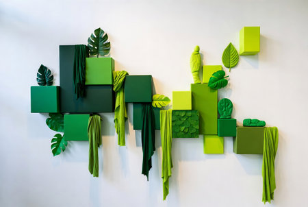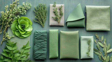 A visually appealing flat lay of various shades of green fabrics and natural greens, perfect for inspiration in design, crafts, and home decor projects.