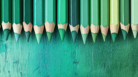 Various shades of green pencils are arranged neatly in a gradient on a textured wooden surface, reflecting a creative and artistic environment. The natural materials enhance the visual appeal.