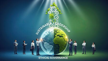 A confident leader guides a diverse group around a leafy planet, symbolizing sustainable teamwork.
