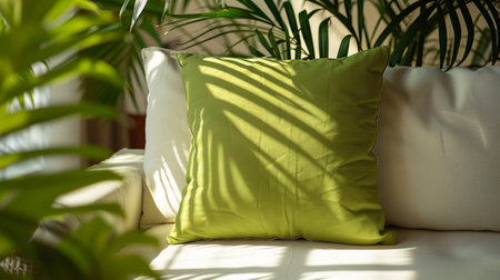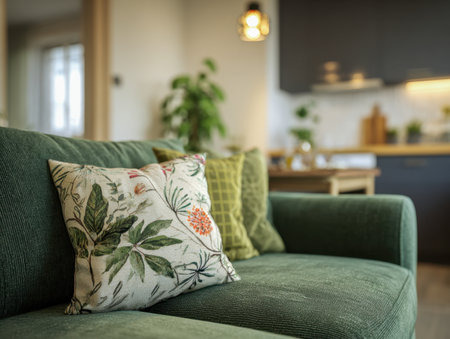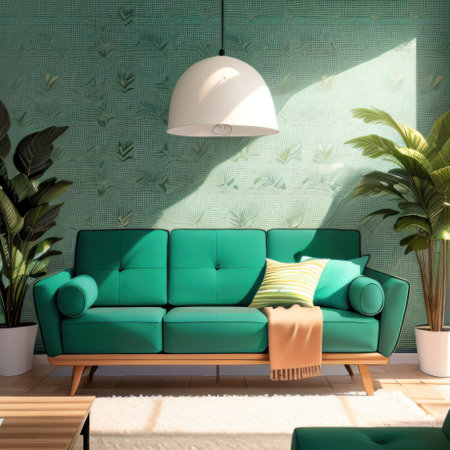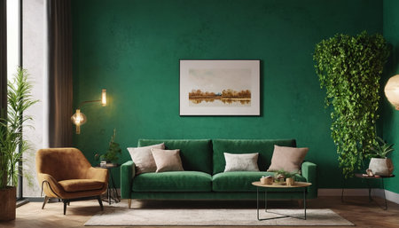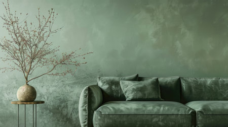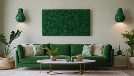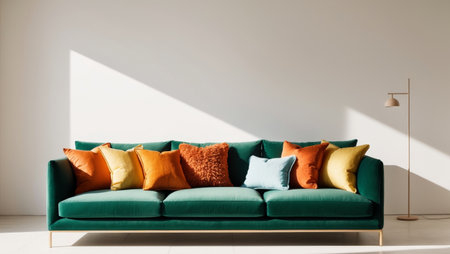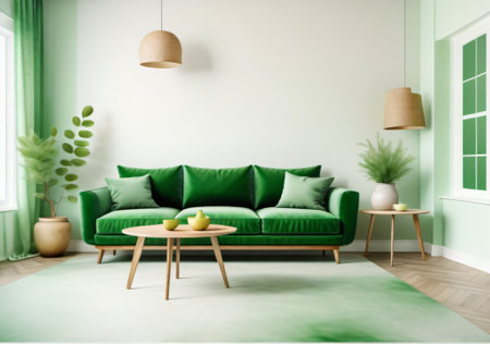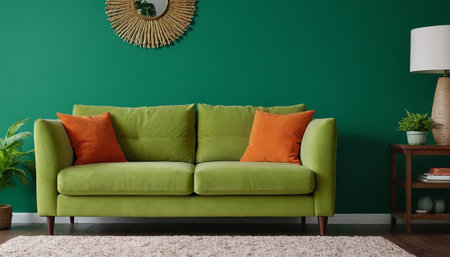 A chic green sofa adorned with colorful cushions sits against a fresh green wall, complemented by a stylish plant and warm lighting. This inviting space radiates comfort and modern elegance, perfect for relaxation and social gatherings.