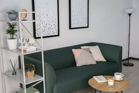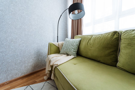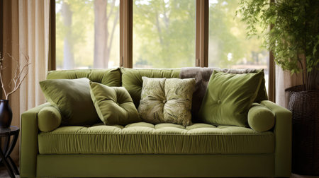 Green sofa with cushions in interior of cozy living room