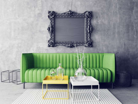 interior with green sofa, 3d render illustration mock-up