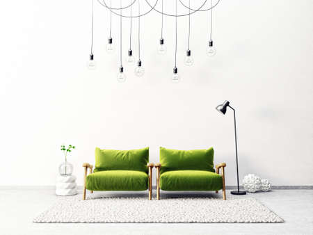 modern living room with green armchair and lamp. scandinavian interior design furniture. 3d render illustration