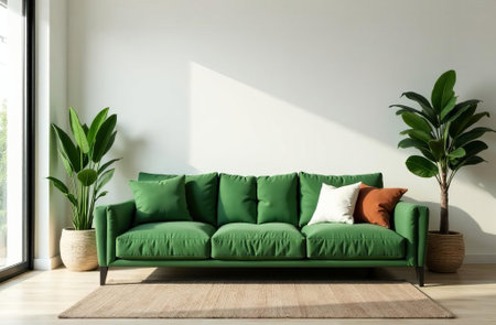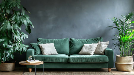 Green sofa in modern living room with plants. 3d render.