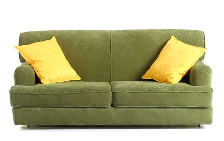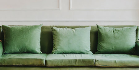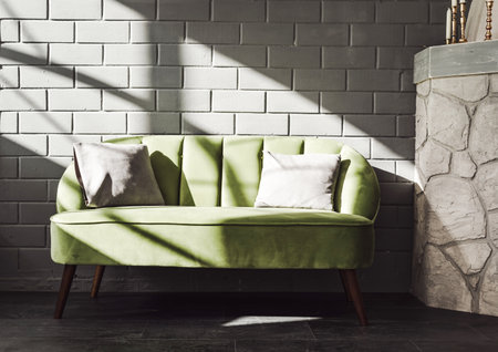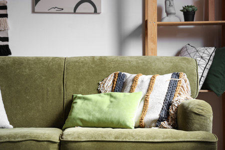 modern green sofa with pillows in room