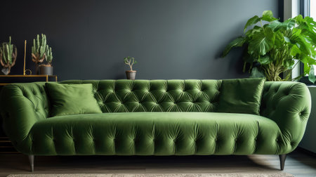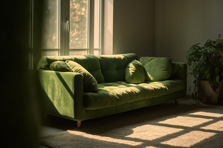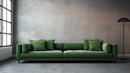 Big Sofa in Modern Room Interior, Luxury Home Furniture, Contemporary Decor, Green Sofa Background, Abstract Generative AI Illustration