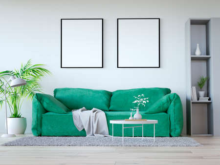 Interior of living room with green sofa and two posters, 3d render