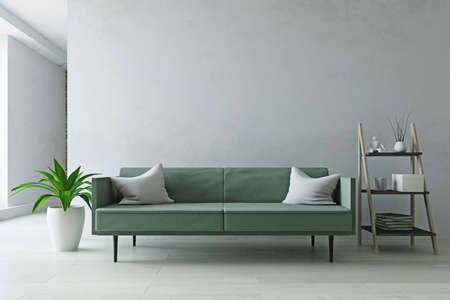 Interior Room with Contemporary Furniture, Green Sofa, Plant and Ladder Shelf near the Old White Wall, Simple Modern Home Decor, Fashion Style, 3D Rendering Illustration, Contemporary Graphic Design