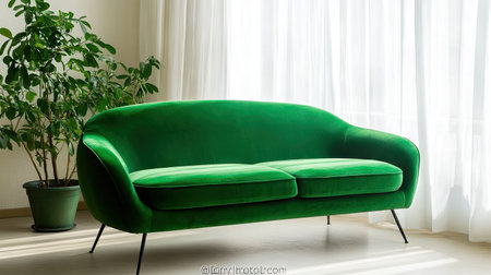 Sofa, a curved sofa with long legs in green velvet fabric, a green plant on the side of it, white curtains behind, a light-colored floor, sunlight streaming through the window, minimalist style, a clean background, high-resolution photography, interior design, product display. --chaos 30 --ar 16:9 --v 6.1 Job ID: fa992875-5628-4bbe-9fe7-1da6d1d336c0
