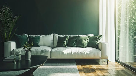 Digitally rendered image of a modern living room featuring a white sofa with dark green cushions, a dark wooden coffee table, and large windows. The room is bathed in natural light and has a peaceful and relaxing ambiance. Greenery and natural light elements are featured.