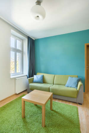 Interior of living room with green sofa, coffee table and map