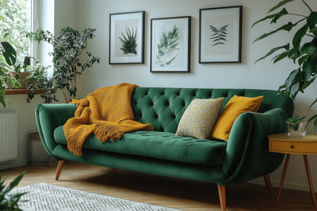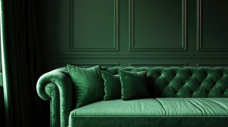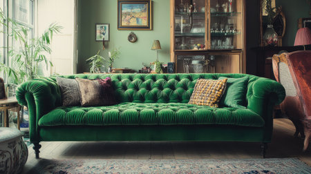 A stunning green velvet chesterfield sofa adorns a vintage living room, inviting comfort and charm. Natural light enhances the cozy atmosphere, showcasing decorative elements.
