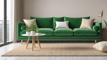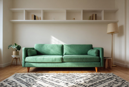 A stylish living room featuring a cozy green sofa perfect for relaxation and modern aesthetics.