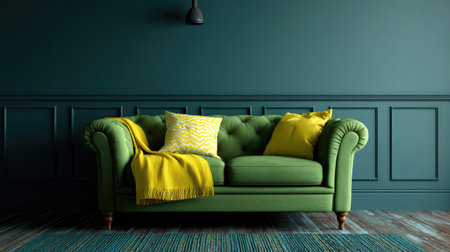 A green sofa is centered against a teal wall, featuring decorative paneling. Yellow pillows and a blanket provide contrasting color accents. The image displays a clean, inviting interior setting, possibly captured with soft lighting. Suitable for use in design, home decor, or lifestyle related projects.