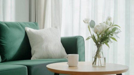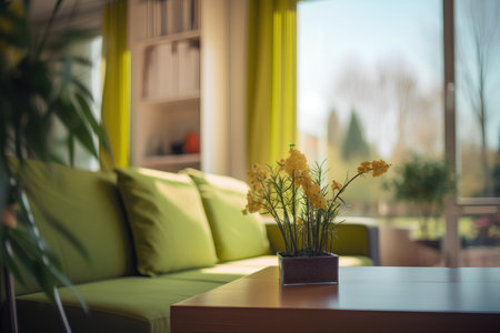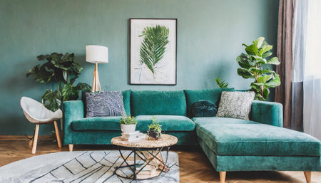 Interior of modern living room with green sofa, coffee table and plants