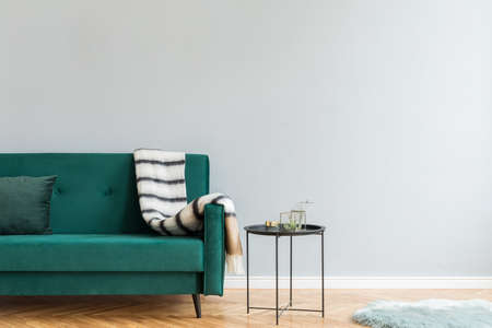 Luxury home interior with green velvet design sofa and blanket. Black coffee table with plant. Grey empty walls. Copy space , mock up poster. Brown wooden parquet. Modern concept of living room.