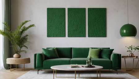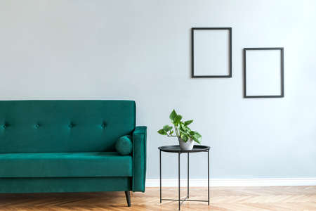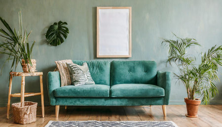 Stylish scandinavian living room interior with design mint sofa, furnitures, vertical mock up posters, plants, and elegant calm vibes