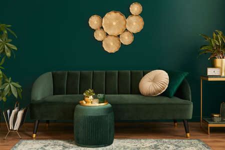 Luxury living room in house with modern interior design, green velvet sofa, coffee table, pouf, gold decoration, plant, lamp, carpet, pillows and elegant accessories. Template.