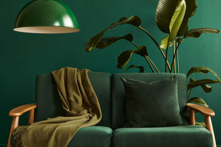 Stylish home interior with green velvet design sofa, tropical plant in metal stand and elegant color pillows and blanket. Copy space for inscription, mock up poster. Brown wooden parquet, grey walls.