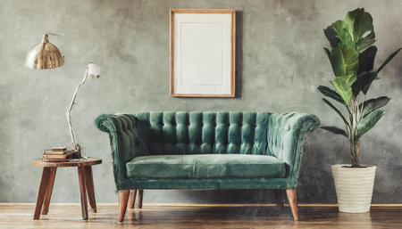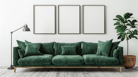 Living room interior with green sofa and blank picture frames on wall.