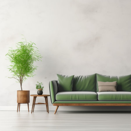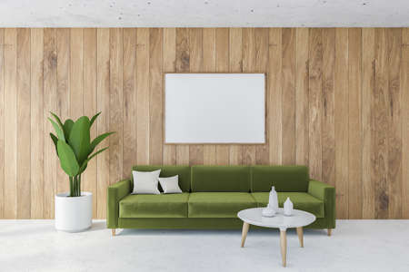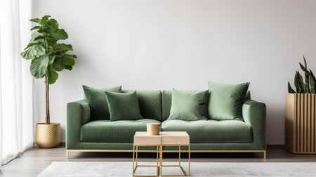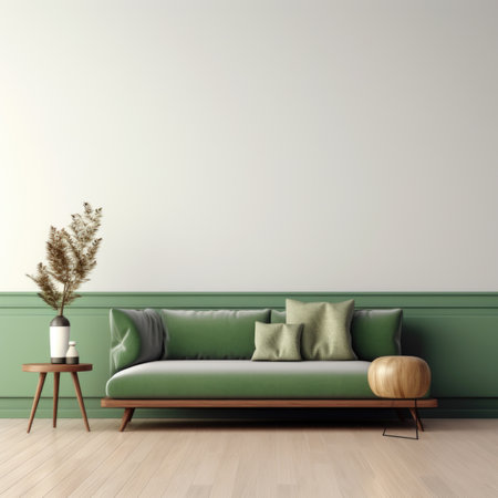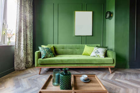 Green sofa and wooden decor accent piece near empty wall with copy space for text. Minimalist interior design of modern living room