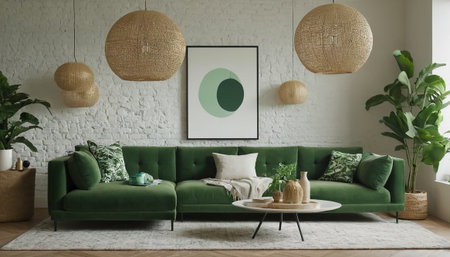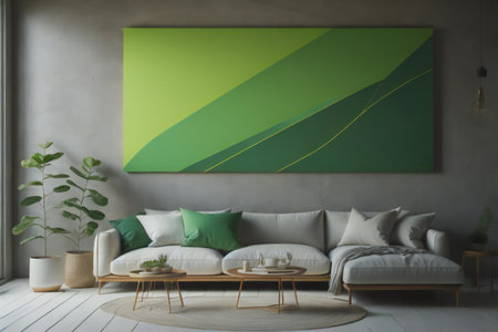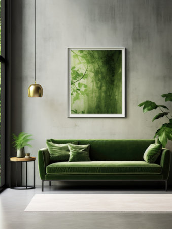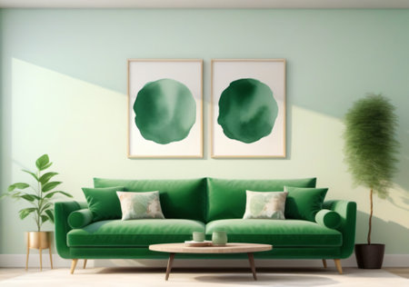 Modern living room interior with sofa, coffee table and green poster. generative ai