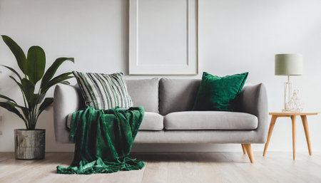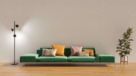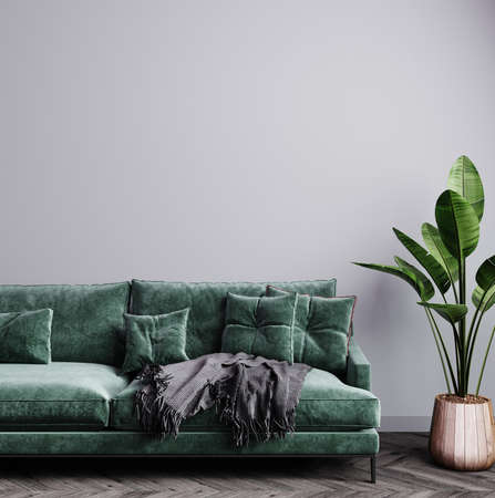 interior house with simple white background mock up. gray velvet sofa with green plaid on . modern space concept. 3d render. Illustration