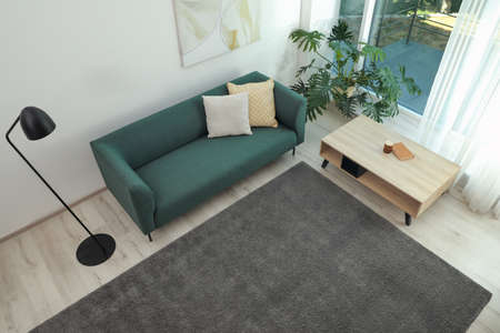 Living room interior with soft gray carpet and modern furniture, above view