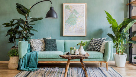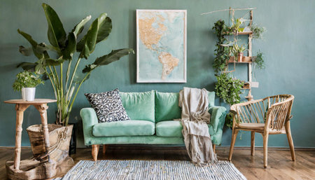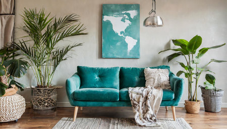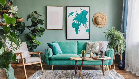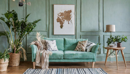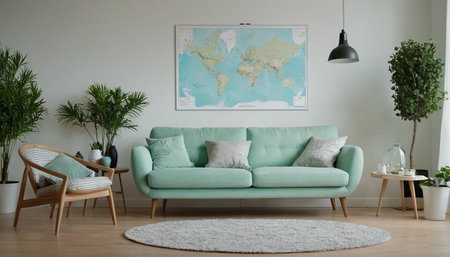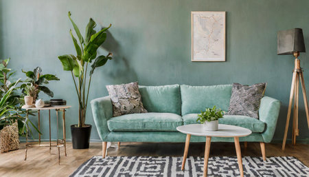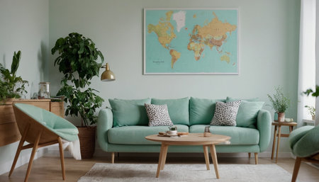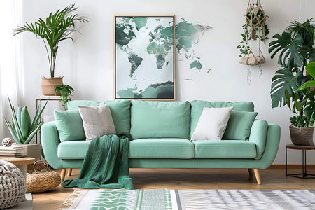 Stylish scandinavian living room interior with design mint sofa, furnitures, mock up poster map, plants, and elegant personal accessories. Home decor. Interior design