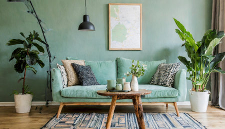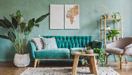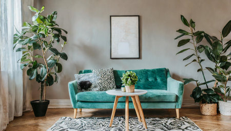 Stylish scandinavian living room interior with design mint sofa, furnitures, mock up poster map, plants, and elegant personal accessories. Home decor. Interior design. Template. Ready to use.
