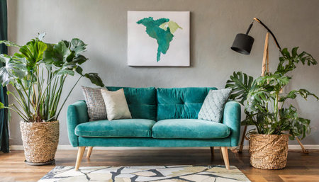 modern living Turquoise sofa in green living room interior with leaves