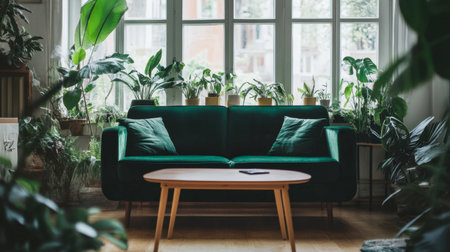 A cozy living room featuring a green couch surrounded by lush indoor plants. Natural light fills the space, creating a serene and inviting atmosphere.