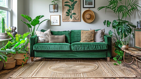 A velvet green sofa, a braided rug, and plants in wicker baskets adorn this stylish bohemian living area.