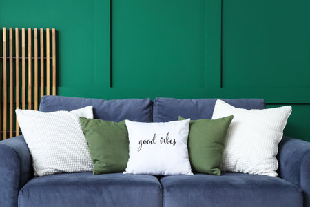 Comfortable sofa with different pillows near green wall in living room