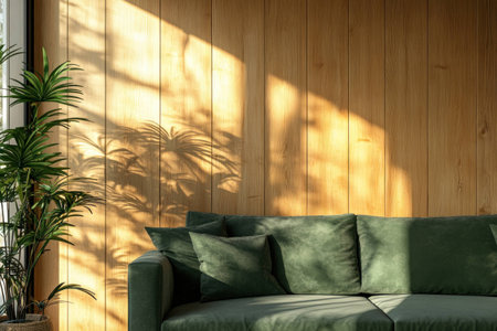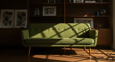 Stylish MidCentury Modern Green Sofa Bathed in Dramatic Sunlight and Window Shadows