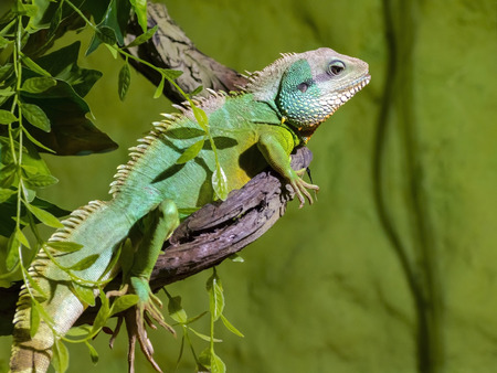 Green water dragon, green water dragon, Physignathus cocincinus in captivity on a tree trunk