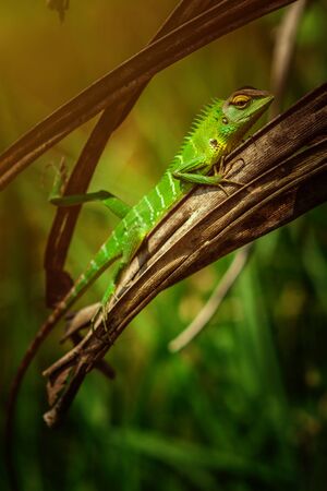 Beautiful green lizard on branches. Bronchocela jubata, commonly known as the maned forest lizard or garden lizard. Close up chameleon details.