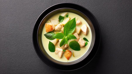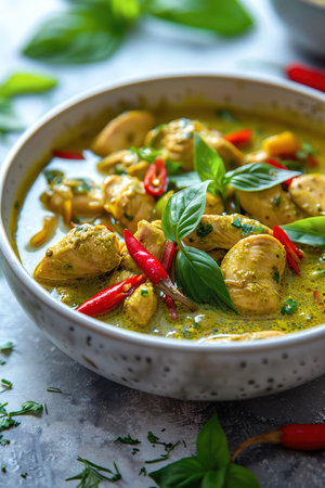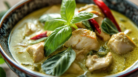 A close-up of creamy Thai green curry with tender chicken, coconut milk, and fresh basil, served in a traditional bowl.